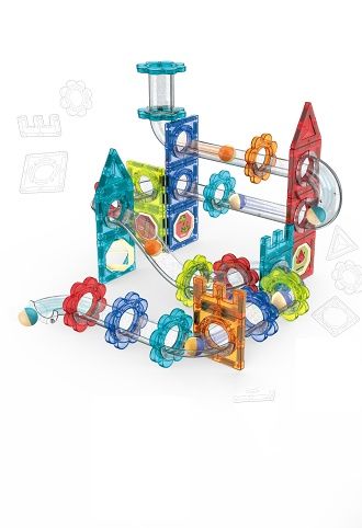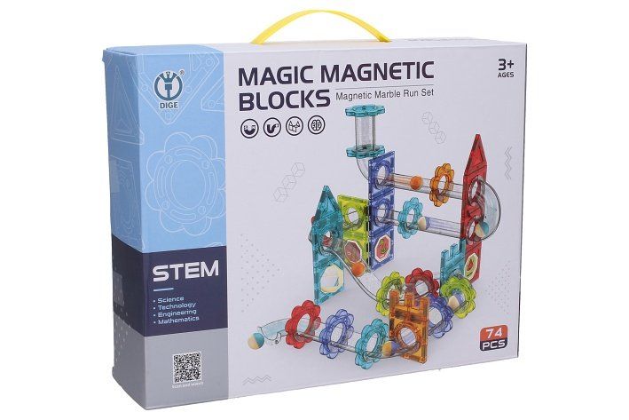 Kuličková dráha magnetická 74ks. Obsahuje magnetickou stavebnici s tunely na tvorbu kuličkové dráhy, nálepky, návod, kuličky.