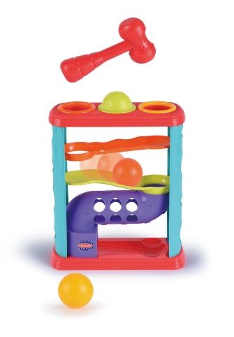 Kuličková dráha zatloukací. Velikost 32cm. Obsahuje dráhu, 3 kuličky a kladívko.