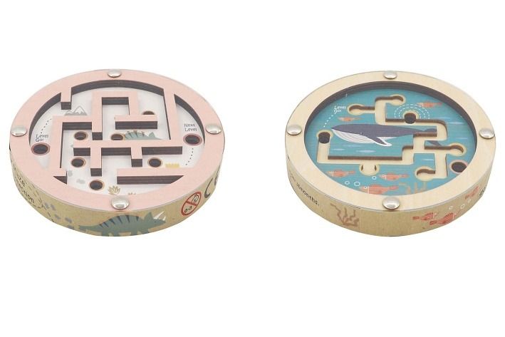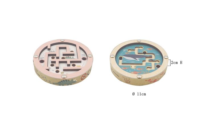 Kuličková hra oboustranná dřevěná. Rozměry 11x11x2 cm. 8 ks display box. 2 varianty - moře, dinosauři.