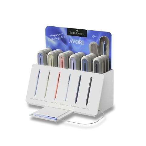 Stojánek na 18 kusů kuličkových per Faber-Castell Avori v šesti barvách. Součástí stojánku je testovací stanice a pero. Rozměr stojánku: š. 36,9 x v. 35,5 x hl. 27,1 cm.