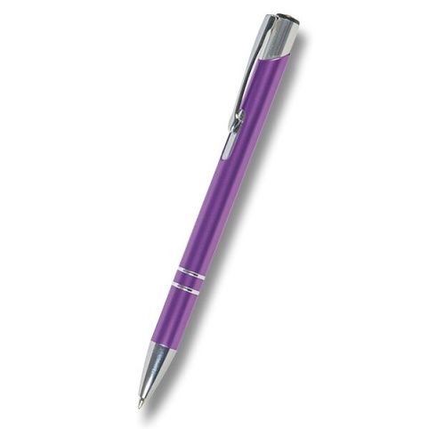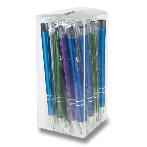 Kuličková tužka s kovovým metalizovaným tělem a pochromovanými doplňky. Velkoobsahová modrá náplň, stiskací mechanismus.Hrot o šíři 1 mm. Mix barev.