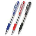 Jednorázové kuličkové pero. Plastové transparentní tělo, plastový klip. Dolní pogumovaný úchop pro pevné držení.