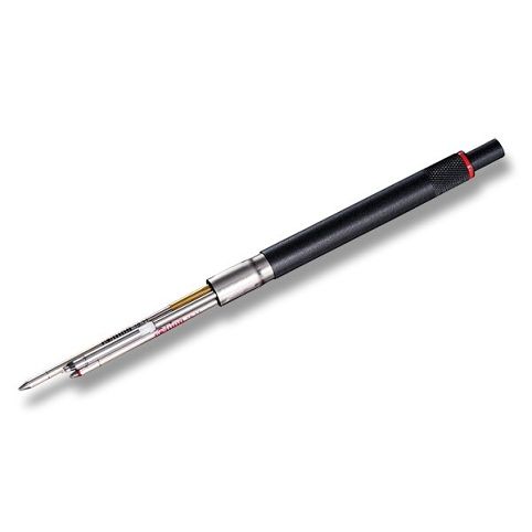 Kuličková tužka Multipen Rotring 600 Black 3 v 1 má celokovové šestiboké tělo sprotiskluzovou rýhovanou úchopovou částí a matně lakované mosazné tělo vkombinaci s doplňky vdané barvě. Kuličková tužka má 3 barvy (modrá, červená, černá) a mechanickou tužku 0,5 mm v 1 Multipenu.