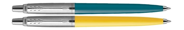 Balení 2 kuličkových tužek Parker Jotter Originals Glam Rock v modré a žluté barvě. Kuličková tužka je vyrobena z barevného tvrzeného plastu s doplňky z nerezové oceli a má stiskací mechanismus. Šíře stopy M.