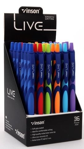 Plastová kuličkové psací propiska Vinson, vysoká kvalita, gelové olejové složení náplně (oil gel inks pen) mix barev. Balení 36 ks v papírové krabičce. Cena za 1 ks.