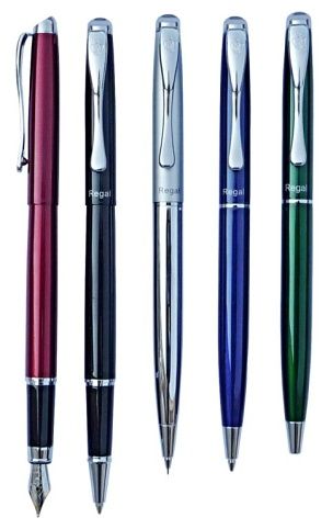 Kuličkové pero s otočným mechanismem, vyměnitelnou náplní uložené v dárkové krabičce, lesklé kovové tělo, náplň modrá + dárková taška Regal