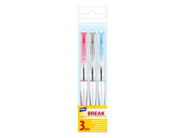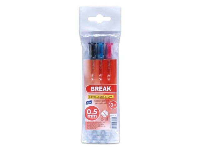 Plastové kuličkové pero BREAK s klipem - 3 ks v balení Provedení: stiskací mechanismus Počet kusů v balení: 3 Barva: červená, modrá, černá Náplň: 5400171, 5400165, 5400166, 5400184, 5400185 Délka: 148mm Uvedená cena je za 1 balení po 3 ks.