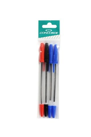 Jednorázová plastová kuličková pera s průhledným tělem pro kontrolu množství náplně. Hrot o šíři 1,00 mm. Pera jsou balena v sáčku po 4ks (2ks modré, 1ks červené, 1ks černé).