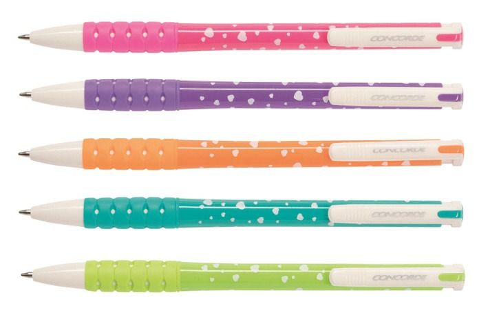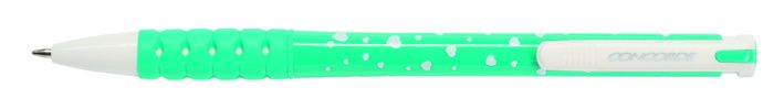 Plastové kuličkové pero v pastelových barvách s motivem srdíček. Gumový úchop, stiskací mechanismus. Dodáváme v mixu barev. Na každém kuse EAN etiketa. Šíře hrotu 0,7mm. Náhradní náplň A3 modrá.
