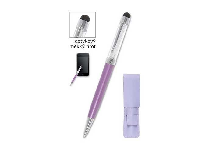 Kuličkové pero s mosazným lakovaným tělem. Transparentní vrchní část s českými krystaly, měkký hrot pro dotykové obrazovky a telefony, pochromované doplňky,součástí je koženkové pouzdro v barvě kuličkového pera, náplň MINI-RD1 modrá.