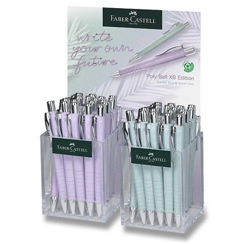 Stojánek 24 ks kuličkového pera Faber-Castell Poly Ball v novém designu s ergonomickou trojhrannou oblastí úchopu z měkkého materiálu. Stojánek obsahuje 2 pastelové barvy. Šíře hrotu 1,4 mm, šíře stopy 0,6 mm