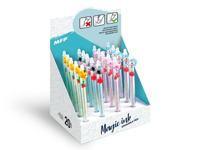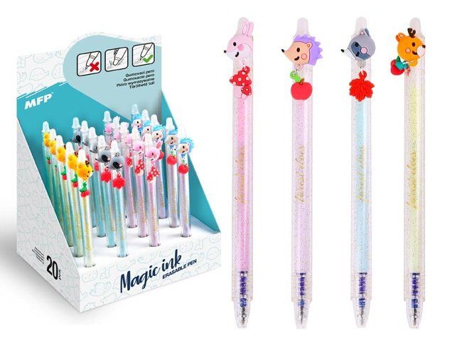 Gumovací kuličkové pero s lesními zvířaty obsahuje speciální inkoust tzv. vymaž a přepiš, nebo vymaž a nech znovu objevit. Pokud uděláte chybu, stačí jen otočit pero a plastovou špičkou text vymažete. Špička zahřeje inkoust, ten zmizí a lze je znovu přepsat. Můžete si psát i tajné vzkazy, po vygumování stačí jen papír ochladit pod bod mrazu a text se znovu objeví. Tato vymazatelná propiska je balena v papírovém stojanu po 20 ks. Přečtěte si, na jakém principu funguje gumovací pero Wizard! Provedení: stiskací mechanismus Počet kusů v balení: 20ks Motiv: lesní zvířata Náplň: 5400196 modrá Náplň: 0,5 mm Cena za 1 ks
