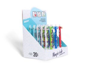 Gumovací gelové kuličkové pero obsahuje speciální inkoust tzv. vymaž a přepiš, nebo vymaž a nech znovu objevit. Pokud uděláte chybu, stačí jen otočit pero a plastovou špičkou text vymažete. Špička zahřeje inkoust, ten zmizí a lze je znovu přepsat. Můžete si psát i tajné vzkazy, po vygumování stačí jen papír ochladit pod bod mrazu a text se znovu objeví. Tato vymazatelná propiska je balena v papírovém stojanu po 20 ks. Přečtěte si, na jakém principu funguje gumovací pero Wizard! Provedení: stiskací mechanismus Počet kusů v balení: 20ks Náplň: 5400196 modrá Náplň: 0,5 mm Cena za 1 ks
