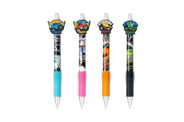 Gumovací pero Speed je ideální volbou pro všechny, kteří mají rádi rychlou jízdu – i na papíře. Na vršku každého pera najdete výrazný 3D model trucku, který dodá psaní pořádný náboj. Barevný pogumovaný grip zajišťuje jisté držení, takže se pero skvěle ovládá i při rychlém psaní poznámek. Hrot 0,5 mm vytváří čistou, tenkou stopu a modrý inkoust je jako stvořený pro každodenní použití. Pokud se při psaní objeví nepřesnost, stačí použít gumovací koncovku — inkoust zmizí během okamžiku a vy můžete pokračovat bez přepisování a škrtání. Přečtěte si, na jakém principu funguje gumovací pero Wizard! Hrot: 0,5 mm Motiv: závodní truck Počet kusů v balení: 36 ks Provedení: stiskací mechanismus Náplň: 5400196 gumovací modrá Uvedená cena je za 1 ks.