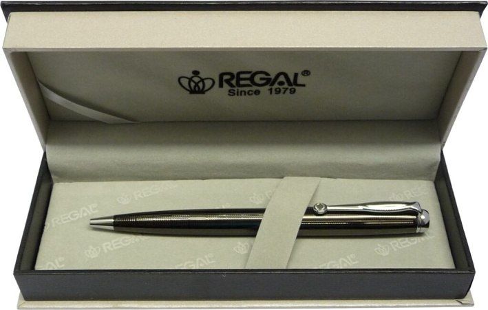 Kuličkové pero s otočným mechanismem, vyměnitelnou náplní uložené v dárkové krabičce, kovové tělo v šedé barvě se stříbrnými doplňky, náplň modrá + dárková taška Regal