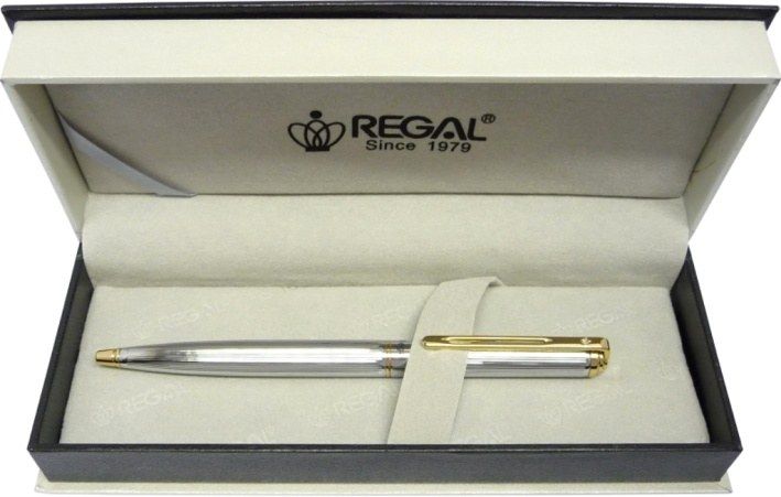 Kuličkové pero s otočným mechanismem, vyměnitelnou náplní uložené v dárkové krabičce, lesklé vroubkovadé kovové tělo se zlatými doplňky, náplň modrá + dárková taška Regal