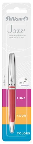 Kuličkové pero K35 Jazz Classic, kovové s pochromovanou vrchní částí a červenou spodní částí těla, s kovovým klipem, leskle lakované, náplň Pelikan 337 M modrá, na blistru