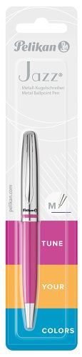 Kuličkové pero K35 Jazz Classic, kovové s pochromovanou vrchní částí a tmavě růžovou spodní částí těla, s kovovým klipem, leskle lakované, náplň Pelikan 337 M modrá, na blistru