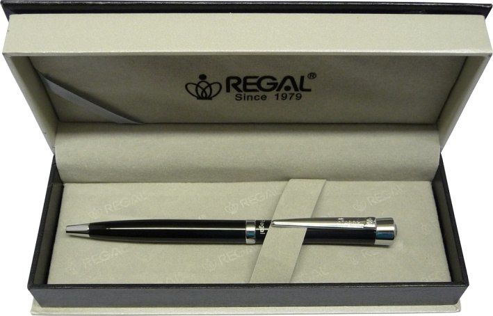 Kuličkové pero s otočným mechanismem, vyměnitelnou náplní uložené v dárkové krabičce, lesklé barevné kovové tělo se stříbrnými doplňky, náplň modrá + dárková taška Regal