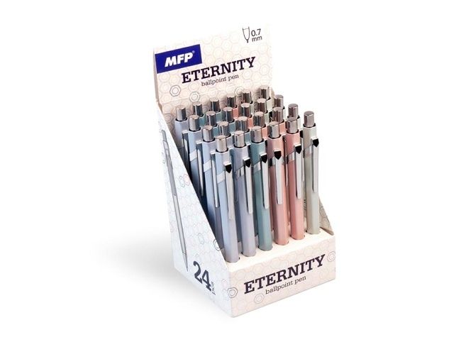 Kovové kuličkové pero Eternity – styl a spolehlivost v každém tahu Elegantní kovové pero Eternity v jemně matném provedení spojuje moderní design s funkčností. Díky hrotu o šířce 0,7 mm nabízí plynulé a přesné psaní, které oceníte při každodenní práci i běžných poznámkách. Náplň s modrým inkoustem zajišťuje čistý a sytý výstup, ať už píšete do diáře, bloku nebo podpisujete dokumenty. Robustní kovové tělo působí luxusně a zároveň zaručuje dlouhou životnost. Praktický klip umožňuje uchycení pera ke kapse nebo desce. Pero je dodáváno v jemných pastelových odstínech – světle růžové, modré, zelené a fialové. Všechny barvy mají jemný kovový (matně perleťový) efekt, díky kterému působí elegantně a decentně zároveň. Hrot: 0,7 mm Počet kusů v balení: 24 ks Provedení: stiskací mechanismus pastelová světle růžová, světle modrá, světle zelená, světle fialová – všechny s jemným kovovým (matně perleťovým) efektem Uvedená cena je za 1 ks.