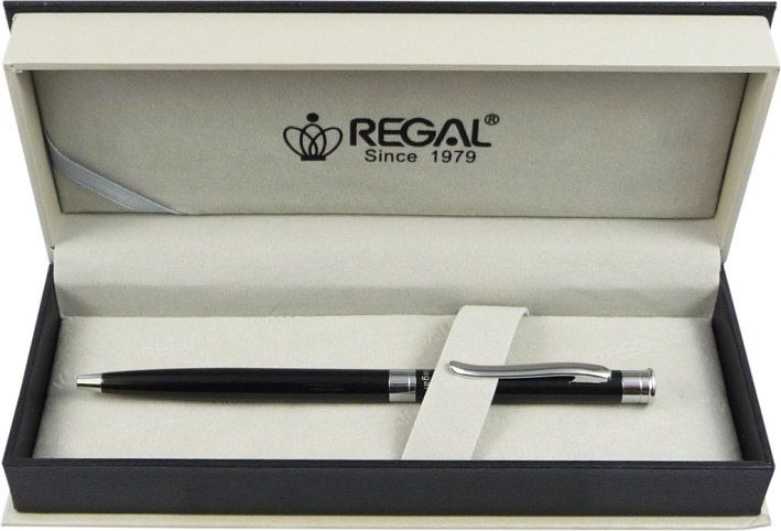Kuličkové pero s otočným mechanismem, vyměnitelnou náplní uložené v dárkové krabičce, lesklé barevné kovové tělo se stříbrnými doplňky, náplň modrá + dárková taška Regal