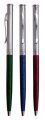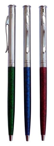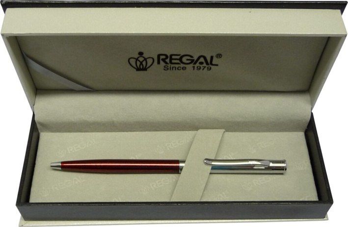 Kuličkové pero s otočným mechanismem, vyměnitelnou náplní uložené v dárkové krabičce, lesklé barevné kovové tělo se stříbrnými doplňky, náplň modrá + dárková taška Regal