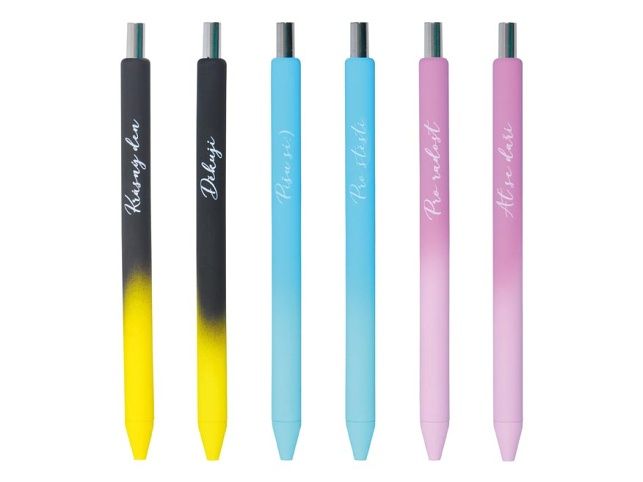 Stylové kuličkové pero Present s modrou náplní a šíří hrotu 0,7 mm zajišťuje hladké a plynulé psaní. Každé pero má jedinečný barevný design s jemným přechodem a pozitivním nápisem, jako například „Krásný den“, „Děkuji“ nebo „Pro radost“ atd. Díky hladkému tělu se dobře drží a hodí se pro každodenní použití ve škole, kanceláři i doma. Perfektní jako milý dárek, který potěší a vykouzlí úsměv. Hrot: 0,7 mm Počet kusů v balení: 24 ks Provedení: stiskací mechanismus Barva: černá/žlutá, tyrkysová, světlá růžová/tmavší růžová Uvedená cena je za 1 ks.