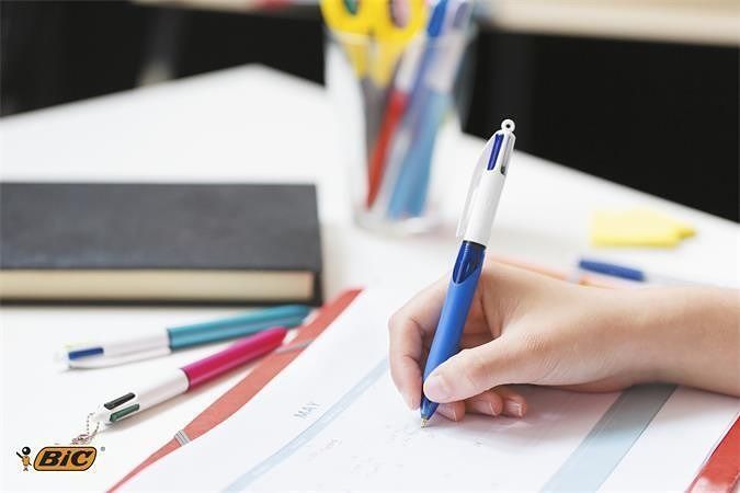 Kuličkové pero BIC 4 Colours Originals Grip, se stiskacím mechanismem. Možnost zavěsit na šňůrku.