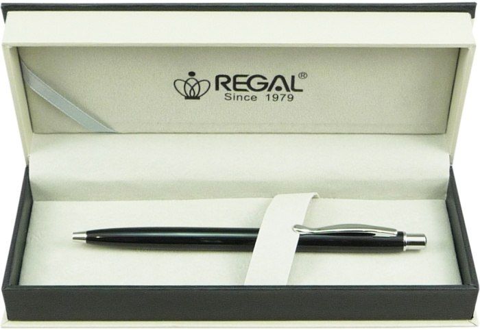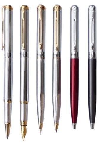 Kuličkové pero s vyměnitelnou náplní uložené v dárkové krabičce, lesklé kovové tělo se stříbrnými doplňky a klipem, náplň modrá