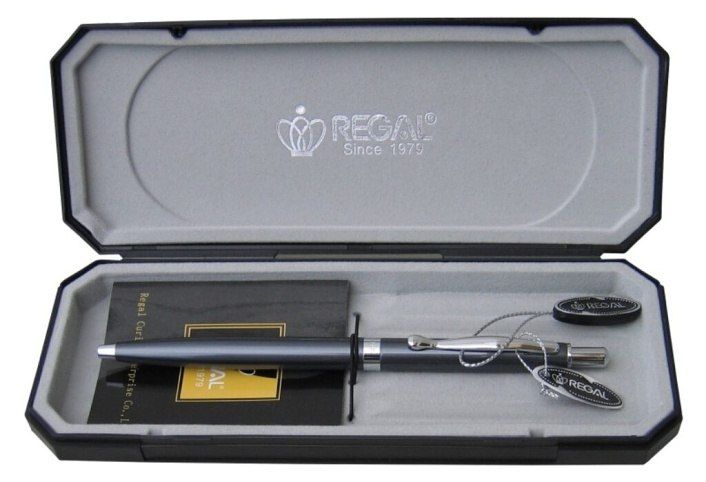 Kuličkové pero s vyměnitelnou náplní uložené v dárkové krabičce, lesklé kovové tělo se stříbrnými doplňky a klipem, náplň modrá