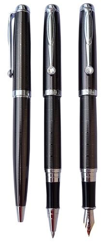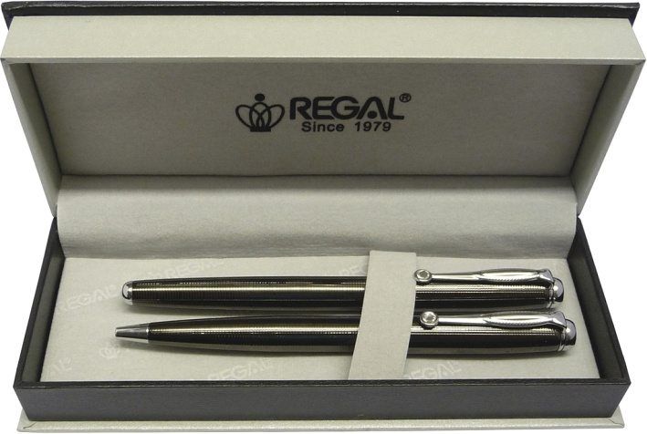 Kuličkové pero s otočným mechanismem, vyměnitelnou náplní + roller s vyměnitelnou náplní uložené v dárkové krabičce, kovové tělo v šedé barvě se stříbrnými doplňky, náplň modrá + dárková taška Regal