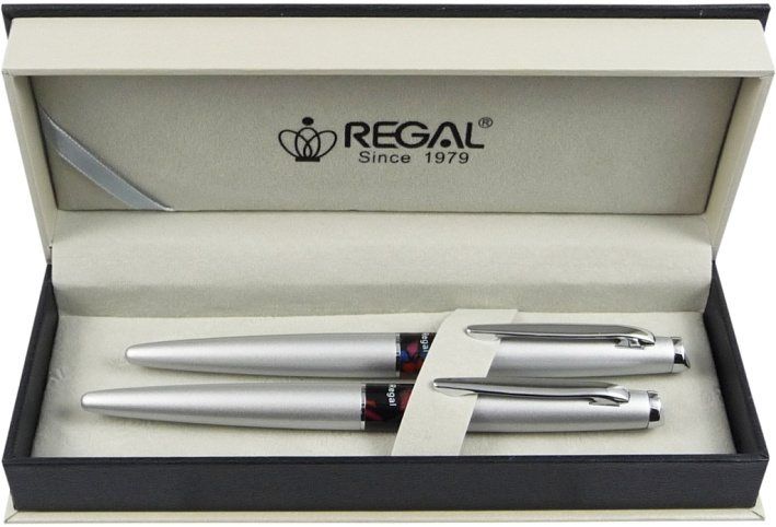 Kuličkové pero s vyměnitelnou náplní + roller s vyměnitelnou náplní uložené v dárkové krabičce, lesklé kovové tělo s barevným kroužkem, náplň modrá + dárková taška Regal