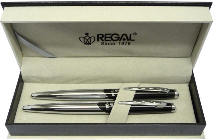 Kuličkové pero s vyměnitelnou gelovou náplní + roller s vyměnitelnou náplní uložené v dárkové krabičce, stříbrné kovové tělo a barevné vičko se stříbrným klipem, náplňě modré + dárková taška Regal