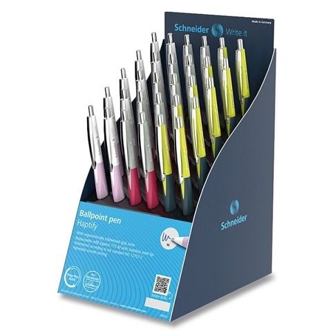 Stojánek 30 ks kuličkového pera Schneider Haptify s trojhranným pogumovaným úchopem. Stiskací mechanismus. Moderní design a atraktivní barvy. Ve 3 barevných provedeních. Modrý inkoust. Kompatibilní i s dalšími náplněmi Schneider. Hrot o šíři 1 mm.