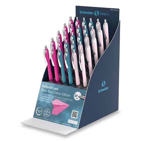 Pultový stojánek Schneider 132 Slider Rave Limited Edition 24 na 30 kusů per. Ve stojánku je mix 3 barev. Kvalitní ocelový hrot XB.