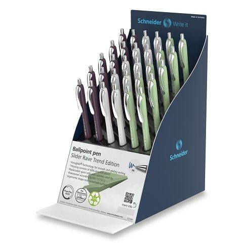 Pultový stojánek Schneider 132 Slider Rave Trend 25 na 30 kusů per. Ve stojánku je mix 3 barev. Kvalitní ocelový hrot XB.