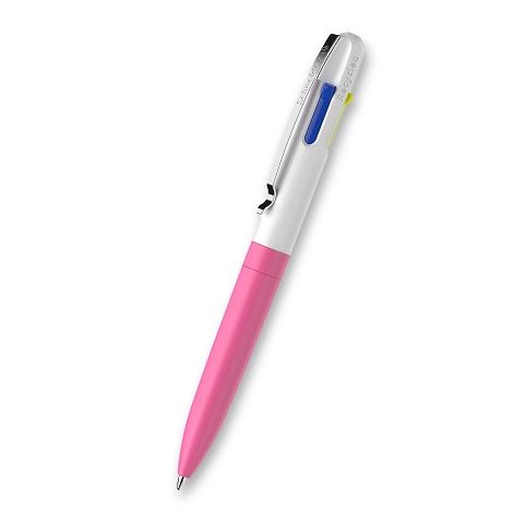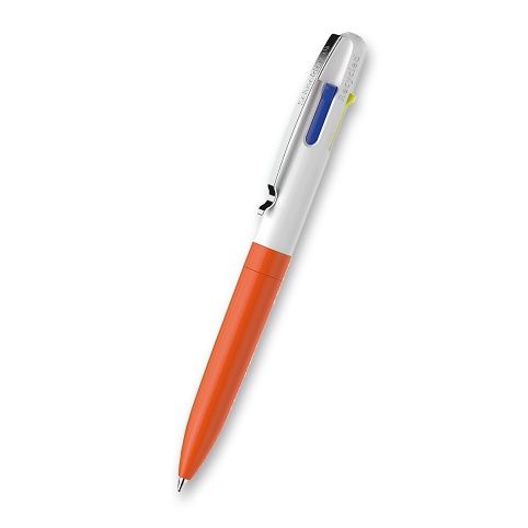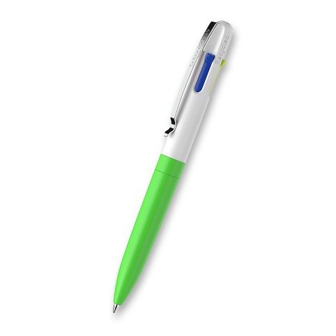 4barevné kuličkové pero ve 4 neonových barvách s technologií Viscoglide®, která spojuje nejlepší vlastnosti tradičního kuličkového a gelového inkoustu. Barvy náplně černá, modrá, žlutá a zelená nebo oranžová nebo růžová. Tělo pera je vyrobené z 92 % z recyklovaného plastu, což ve srovnání s použitím konvenčního plastu ušetří více než 84 % emisí CO2. Stiskací mechanismus je umístěný po straně. Odolný kovový klip. Hrot o šíři 1,00 mm. Vhodné ke psaní na dokumenty.