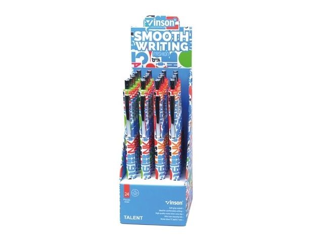 Kuličkové pero s klikacím mechanismem, dostupné v pestrém designu s motivy písmen. Pero má hrot o tloušťce 0,7 mm, který zajišťuje jemné a přesné psaní. Tělo pera je ozdobeno pestrými barvami. Pero je opatřeno praktickým klipem, který umožňuje snadné přichycení na zápisník nebo kapsu. Ideální pro každodenní použití a pro ty, kteří ocení kreativní a nápaditý design. Hrot: 0,7 mm Motiv: písmena Počet kusů v balení: 24 ks Provedení: stiskací mechanismus Uvedená cena je za 1 ks.