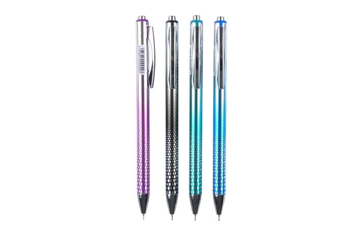 Kuličkové pero, dostupné v mixu barev, je opatřeno hrotem o tloušťce 0,7 mm, který zajišťuje jemné a přesné psaní. Pero je vybaveno náplní se speciálním olejovým inkoustem, který zlepšuje plynulost psaní a zároveň zamezuje rozmazávání. Design těla je zvýrazněn jemným vzorováním. Pero je také vybaveno kovovým klipem pro snadné přichycení na zápisníky nebo kapsy. Ideální pro každodenní použití v kanceláři, škole nebo domácnosti. Hrot: 0,7 mm Počet kusů v balení: 24 ks Provedení: stiskací mechanismus Barva: fialová, černá, tyrkysová, modrá Uvedená cena je za 1 ks.