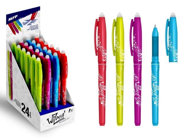 Magické kuličkové pero Wizard obsahuje speciální inkoust tzv. vymaž a přepiš, nebo vymaž a nech znovu objevit. Pokud uděláte chybu, stačí jen otočit pero a plastovou špičkou text vymažete. Špička zahřeje inkoust, ten zmizí a lze je znovu přepsat. Můžete si psát i tajné vzkazy, po vygumování stačí jen papír ochladit pod bod mrazu a text se znovu objeví. Přečtěte si, na jakém principu funguje gumovací pero Wizard! Provedení: s vrškem Počet kusů v balení: 24ks Barva: černá, modrá, fialová, zelená Náplň: 5400186, 0,7mm Délka: 142mm Uvedená cena je za 1 ks. Tato vymazatelná propiska je balena po 24 ks v praktickém papírovém stojánku.