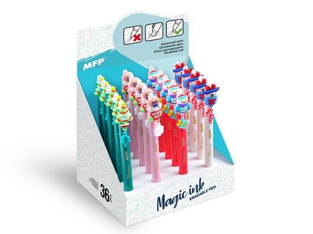 Gumovací kuličkové pero s motivem vánoc obsahuje speciální inkoust tzv. vymaž a přepiš, nebo vymaž a nech znovu objevit. Pokud uděláte chybu, stačí jen otočit pero a plastovou špičkou text vymažete. Špička zahřeje inkoust, ten zmizí a lze je znovu přepsat. Můžete si psát i tajné vzkazy, po vygumování stačí jen papír ochladit pod bod mrazu a text se znovu objeví. Tato vymazatelná propiska je balena v papírovém stojanu po 20 ks. Přečtěte si, na jakém principu funguje gumovací pero Wizard! Provedení: stiskací mechanismus Počet kusů v balení: 20ks Motiv: vánoce Náplň: 5400196 modrá Náplň: 0,5 mm Cena za 1 ks