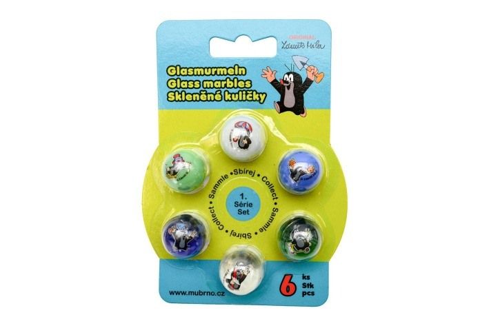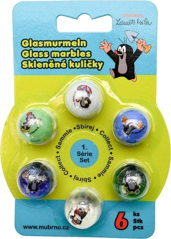Zahrajte si s dětmi venku kuličky a nasbírejte všechny barvy i obrázky! Skleněné kuličky s obrázkem Krtka mají pr.25mm, balené na blistru, 8 různých motivů grafiky, 6 barev skla (3× čiré + 3× matné).