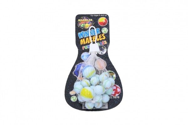Kuličky cvrnkací mramorované skleněné různé velikosti v síťce na kartě 10x19cm