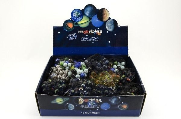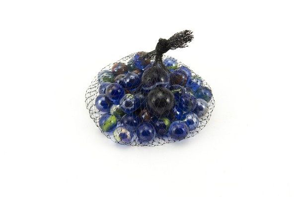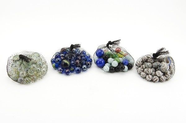 Kuličky skleněné cvrnkací různé velikosti asst 38+2 ks v síťce 7x7cm