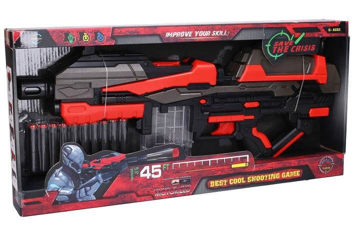 Kulomet s 10 pěnovými náboji. Rozměry 54x6x21,5 cm. 4xAA baterie nejsou součástí. Přepínač ON/OFF na levé straně zbraně nad spouští. Posunem červeného tlačítka uvolnění zásobníku. Zásobník pro 6 nábojů. Obrázkový návod s popisem na zadní straně obalu.