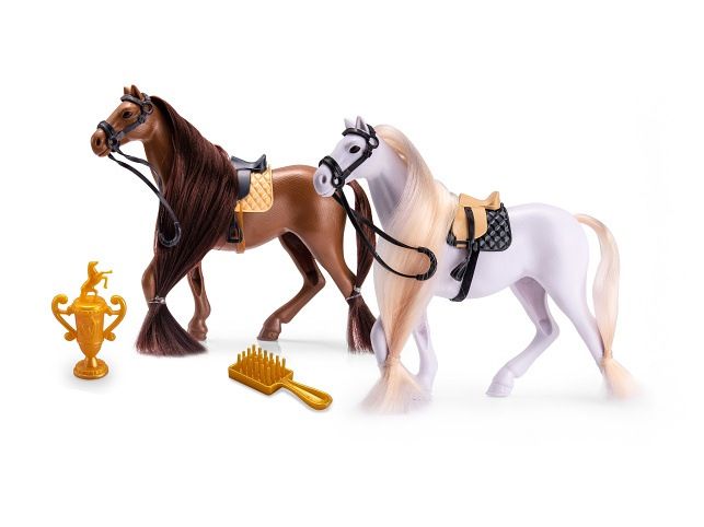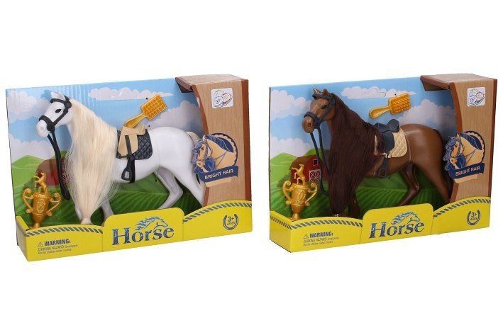 Kůň. 2 varianty - hnědá a bílá. Velikost 19cm. Obsahuje koně se sedlem a uzdou, trofej a kartáč.