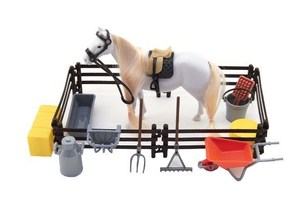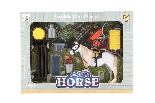 Kůň česací bílý plast s doplňky a ohradou v krabici 34x25x5cm