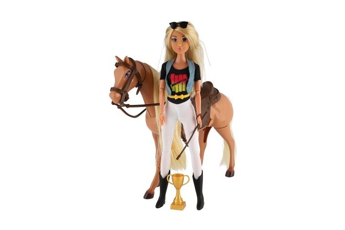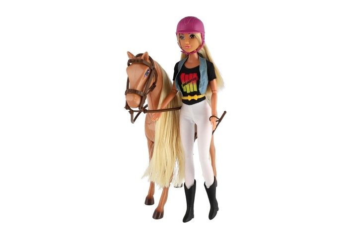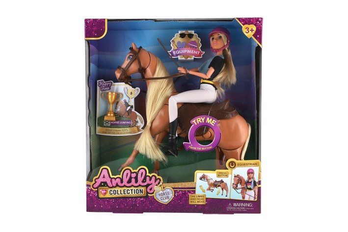 Všechny malé milovnice koní potěší panenka žokejka s koníkem, který má dlouhou hřívou a ocas. Panence nechybí jezdecké oblečení a helma. Koník má sedlo a uzdu a hýbe hlavou a končetinami.