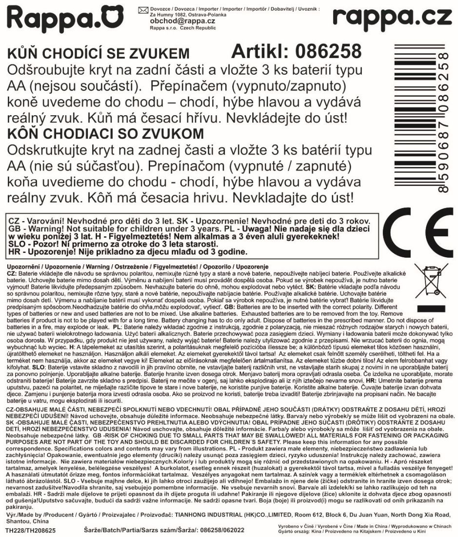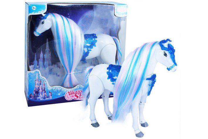 Krásný chodící kůň, který hýbe hlavou a vydává zvuk jako opravdový kůň. Kůň má také úžasnou česací hřívu. K aktivaci je potřeba vložit 3 ks baterií typu AA (není součástí).