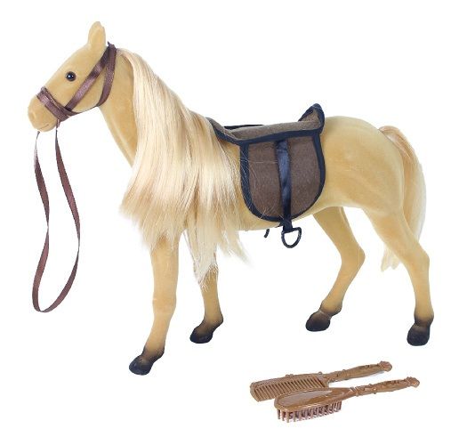 Kůň fliska se světlou hřívou a sedlem. Koně můžeš také učesat, a to třeba jedním ze dvou hřebenů, které najdeš v balení. Velikost koně 35 cm.